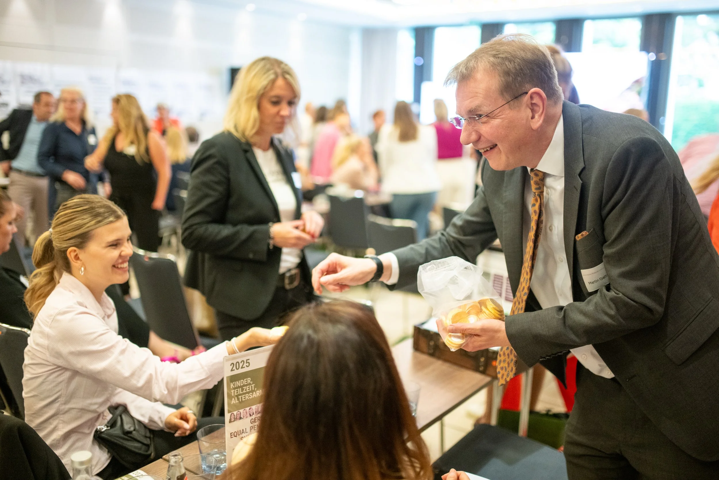 Unternehmenslenker:innen, HR-ler:innen, Mütter, Väter, Care-Gebende, Verbände, Politiker:innen, Altersvorsorge-und Vereinbarkeits-Expert:innen, Finanzberater:innen treffen, diskutieren für MEHRWERT.